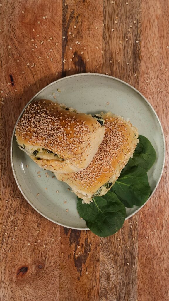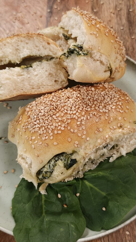 Rozwałkuj ciasto, wyłóż na środek masę szpinakową. Złóż ciasto „na trzy”, Wytnij 12 bułeczek i odstaw do wyrośnięcia na około 30 minut.