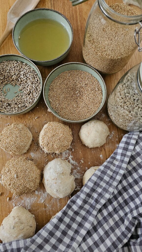 Wymieszaj ciepłą wodę z miodem. Kolejno zamaczaj w niej bułki, następnie dół obtocz w słoneczniku, a górę w sezamie.