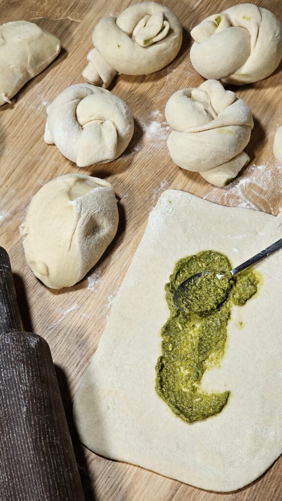 Każdą część rozwałkuj, posmaruj łyżeczką pesto, zwiń w roladkę i zrób „supełek”. Odstaw na 30 minut do wyrośnięcia.