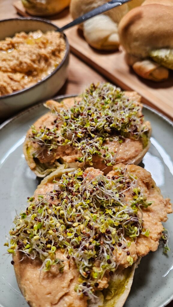 Uwielbiane w moim domu gorące bułeczki z pesto. Dzisiaj w wersji z hummusem i kiełkami.