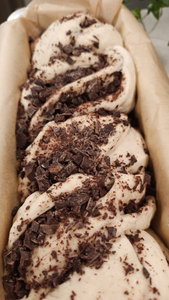 Rozwałkuj ciasto i posyp posiekaną czekoladą. Zwiń w rulon, przetnij wzdłuż i zapleć.