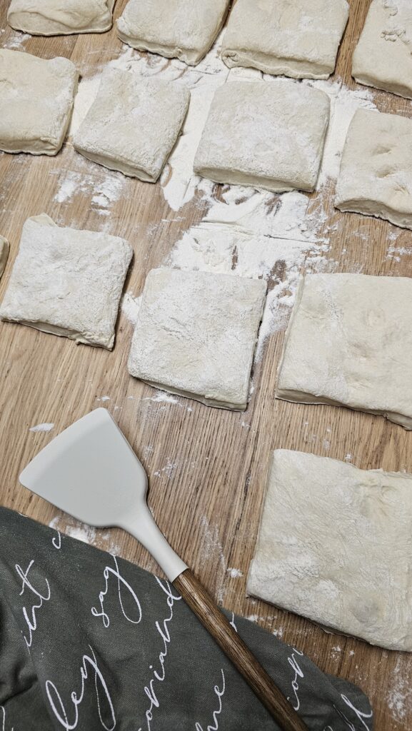 Delikatnie przełóż ciasto na blat obsypany obficie mąką. Posyp mąką górę ciasta i rozciągnij je na prostokąt o bokach około 30/40 cm. i grubości około 2 cm. Uważaj, żeby nie uszkodzić pęcherzyków powietrza powstałych przy wyrastaniu.