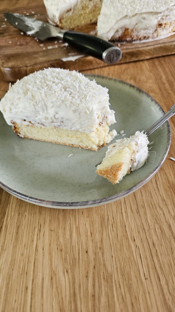Podziel krem na dwie części. Do jednej dodaj pokruszony biszkopt, wyłóż na spód ciasta, który został w formie. Do drugiej dodaj posiekane migdały i również wyłóż na ciasto. Posyp grubo kokosem i wstaw do lodówki (najlepiej na całą noc).