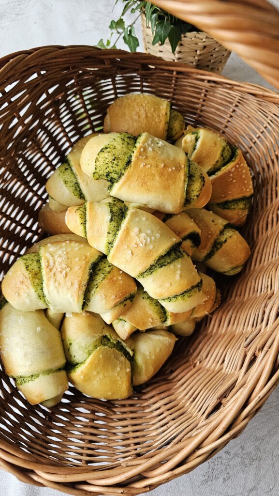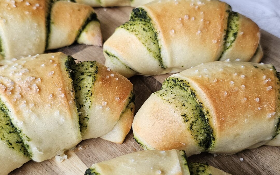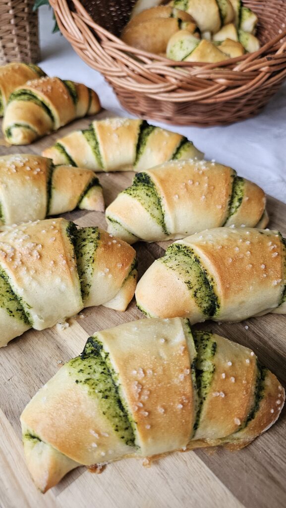 Przełóż ciasto na blat obsypany mąką i rozwałkuj na prostokąt. Przetnij prostokąt na dwa długie paski, każdy posmaruj farszem, pokrój na trójkąty i zwiń w rogaliki (tutaj pokazuje jak to zrobić). Ułóż je na blaszce i odstaw na 30 min do wyrośnięcia. Po tym czasie dokładnie posmaruj każdego rogalika rozkłóconym jajkiem i posyp odrobiną soli gruboziarnistej. Rogaliki mogą pękać w miejscu gdzie nie zostaną dokładnie posmarowane jajkiem.