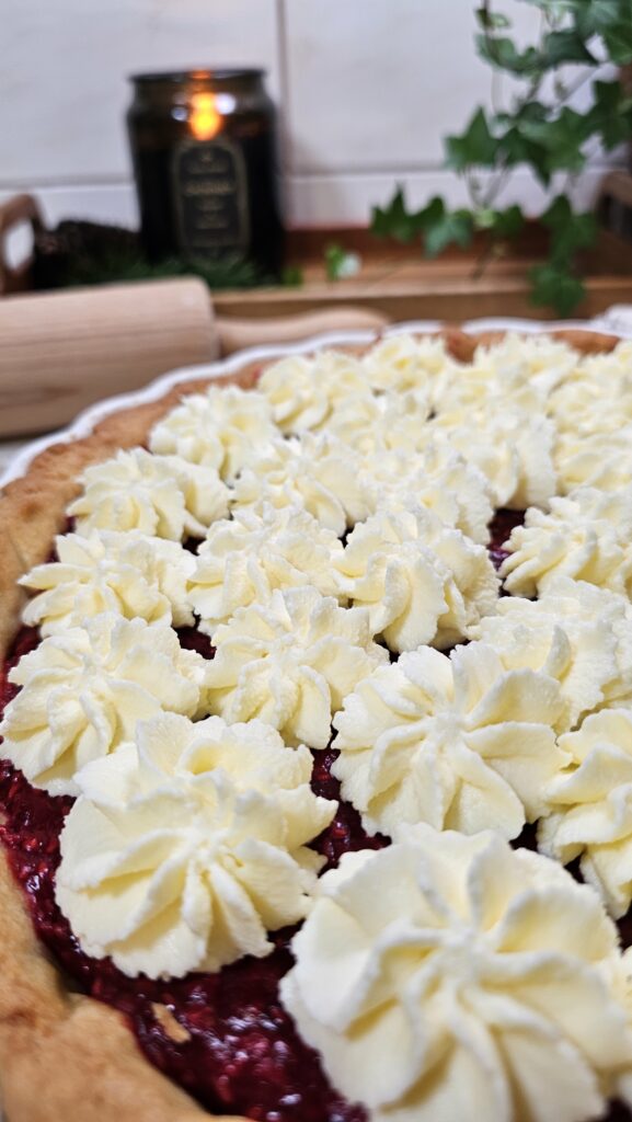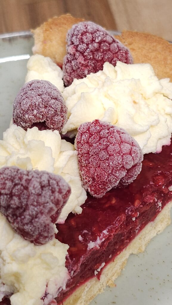 Maliny na kruchym cieście, przykryte mascarpone z białą czekoladą to idealne połączenie słodyczy ze świeżą nutą lekko kwaśnych owoców.